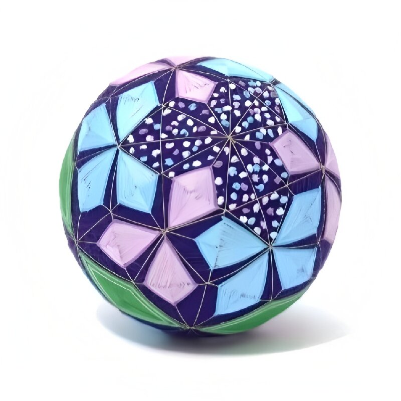 This Temari ball features deep blues and purples, adorned with bright green and pink geometric patterns, forming a complex and intriguing labyrinth, like a starlit night sky.