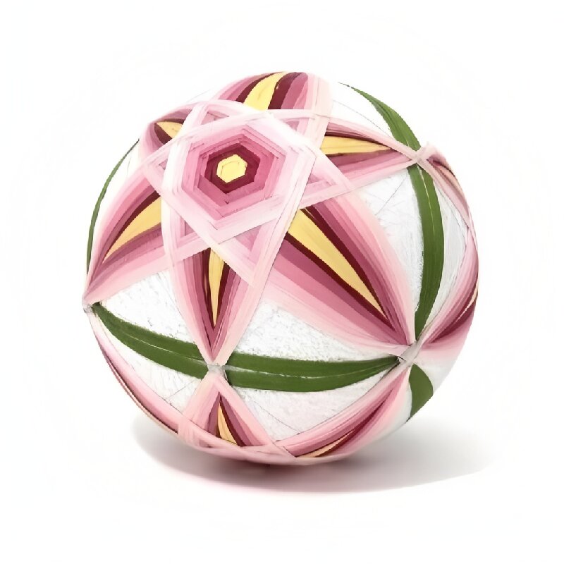 This Temari ball primarily features warm oranges, pinks, and beiges, paired with striking geometric patterns, reminiscent of a sunrise, full of hope and new beginnings.